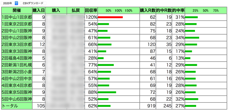 一番馬券を買ったのはルメールということになる。しかし回収率は58%とふるわない。次の福永はそこそこいいが、贔屓にしている北村友一が56%とこれもあまり相性がよくない。上位で100%超えは川田将雅で今年も仲良くしたい。一方でなぜか池添謙一とは仲が悪い。田辺、三浦、横山親子ともいまいちだ。いや、横山和が100%超えてるな。2020年は「なんだか江田照男がバンバン穴開けてるな」という印象があったが、それにも乗れず。ともかく、北村友一と仲良くしたい。