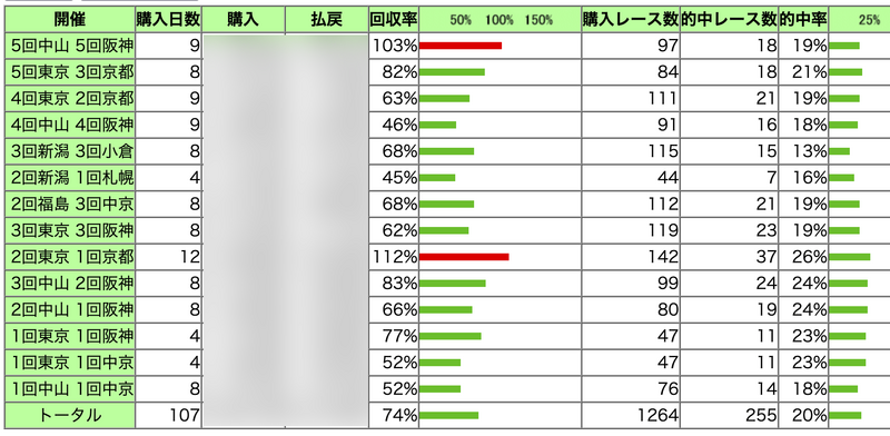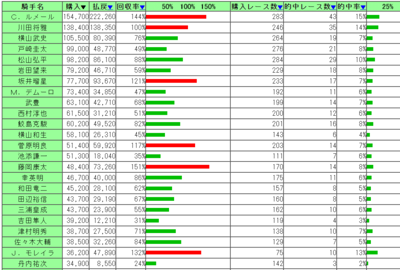 女性騎手はなんか当たっている印象があったが、古川奈穂だけプラスだった。高倉、長岡の0%とかはまあ、一本当たっていたらくらいしか買っていない。