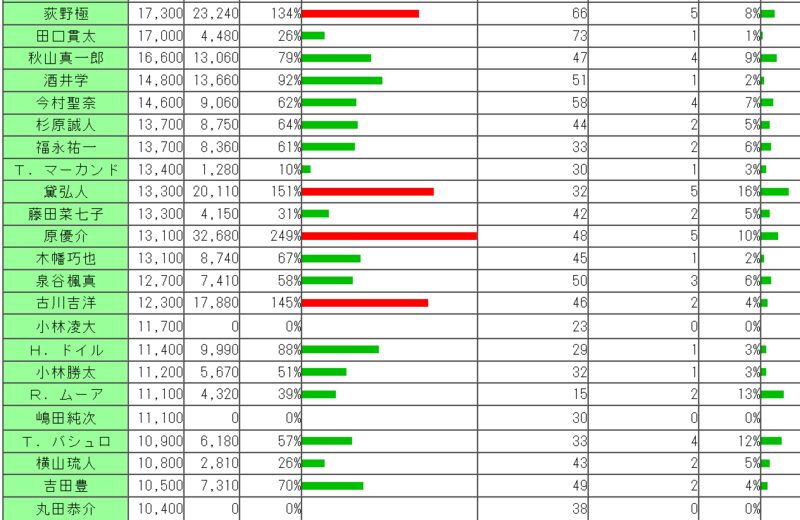 若手では坂井瑠星で勝てているのはいい傾向。ホープフルステークスは矢作調教師の雷が落ちたが、今後どんどん勝ってくると思う。池添は大きく凹んでるな。好きな騎手だしな。田辺、津村あたりは相性がよくないと思っているが、まあまあ。丹内は買えばこないが、買わなければくるという印象があって、印象通り。あと、浜中の3%ってのはなんだ。これはもうひどいな。亀田温心は推している騎手だが、あまり買ってない。田口君は注目しているが、買えばこないという感じ。買えばよかった、ということは何度かあった。