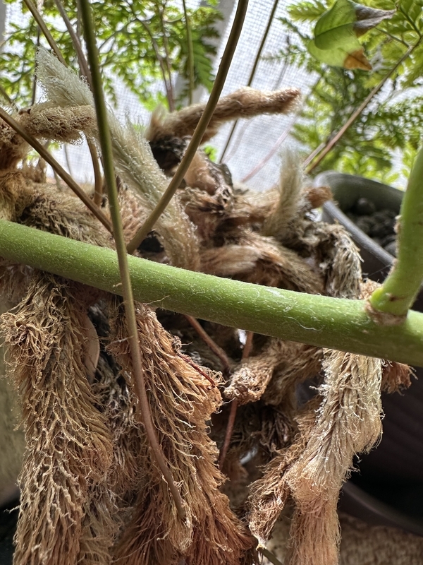 意味もなくトキワシノブ。横切っている緑色の枝はひどい形に徒長しているアボカド。