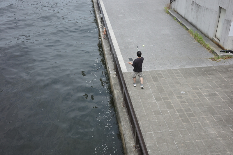 少し間違えればボールが川に入ってしまう、テニスのピープル。