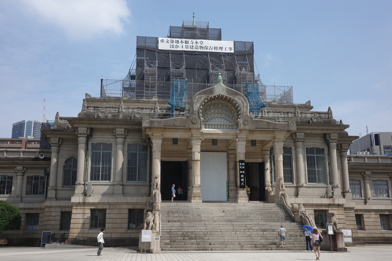 築地本願寺(工事中)。結婚式や法要(?)が行われていた。少し中で涼む。ショップがあったので行ってみたら、高橋源一郎の本が売っていたので買った。