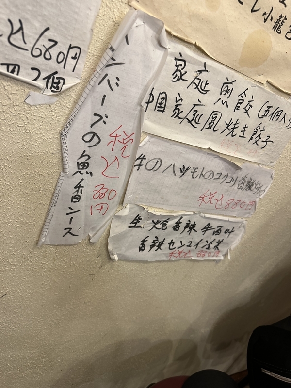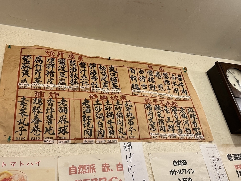 このメニュー表から注文はできない。とはいえ、今どきのガチ中華のタブレット方式でもない。年季の入ったメニュー表から口頭で注文。日本酒など充実してそうだったが、メニュー表のそれはなく、看板からとのことだった。