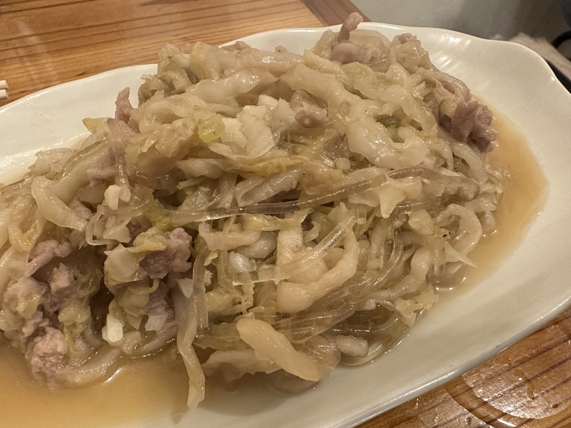 人気メニューの白菜の漬物(ザウアー?)と豚肉の炒め物。いや、ぜんぶ美味しいわ。