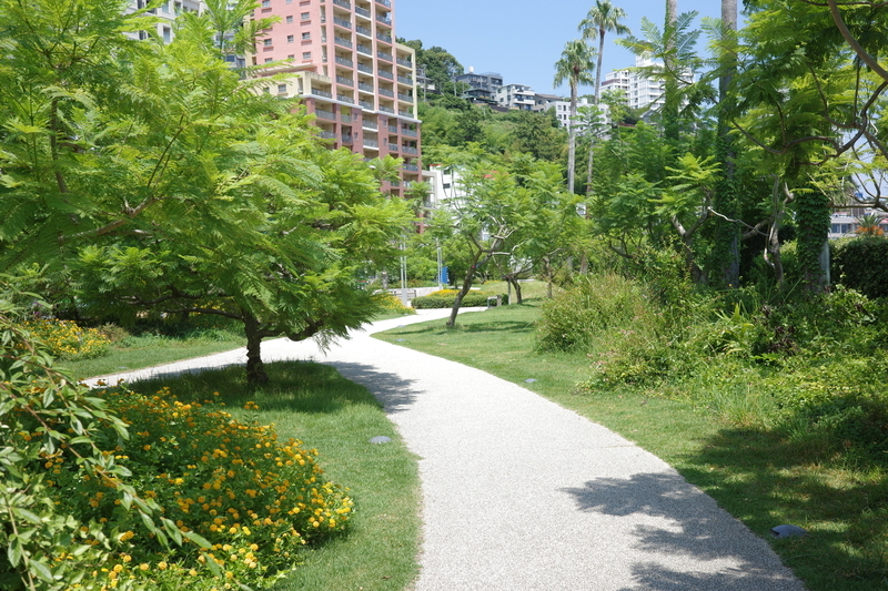 朝食後、ビュッフェ会場の上にある屋上庭園に出てみる。もうすでに夏の暑さがえぐい。しかし、風景はいい。