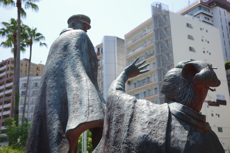 角度を変えてバイオレンス。令和のこの時代、バイオレンスは避けられる傾向にあるのか、ただただ暑いせいかわからないが、貫一お宮の像を見に来ている人はぜんぜんいなかった。お宮も蹴られ損というものだ。