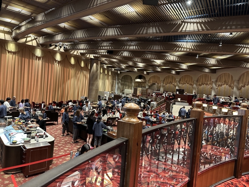 夕食はビュッフェ(の安いコース)。メインダイニング錦はむちゃくちゃ広い。体育館より広い。で、おれはビュッフェというか、食べ放題というものをほとんど体験したことがないので、はっきり言ってかかっていた。1000mつうか58秒台前半くらいの暴走だ。連れの人は、「量とペースが早すぎる」と思ったらしいが、「楽しいそうに食べているからいいか」と判断された結果、おれは早々にバテてしまった。いろいろな罠にはまった。味はというと、美味しかったんじゃないでしょうか。いや、わからんけど。