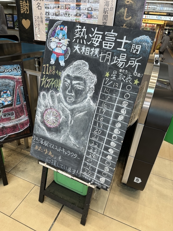 熱海駅にて。熱海富士はがんばっていた。おれのちょっと前からのひいきは安青錦なのだけれど(こんなに早く優勝争いするとは思わなかった)。まあいい。